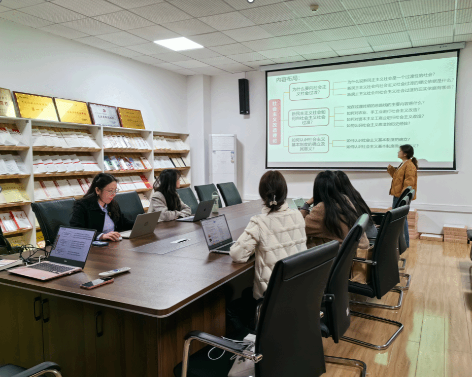 会议开始,袁雪齐老师首先对本专题定位进行了分析。她指出,社会主义改造理论是毛泽东思想的核心内容之一,集中体现了毛泽东关于从新民主主义向社会主义过渡的战略思想。从教材框架看,既承接了第二章“新民主主义革命理论”,解决了革命胜利后如何向社会主义过渡的问题,又为第四章“社会主义建设道路初步探索的理论成果”提供了制度基础。通过社会主义改造,中国完成了从新民主主义社会到社会主义社会的转变,开启了独立探索社会主义建设道路的进程。这种逻辑链条体现了毛泽东思想中“革命—改造—建设”的连贯性。教师在授课过程中,应着重引导员工理解社会主义改造的必要性、过程及其历史意义,以树立正确的历史观与制度自信。接着,袁老师通过构建问题链的方式,分享了本专题的教学思路。她以“为何要进行社会主义改造”“如何进行社会主义改造”“社会主义改造的成效与影响”等关键问题为引领,逐步引导员工深入思考,激发员工的求知欲与探索欲。此外,她还从“知识”“能力”“价值”三个维度阐述了本专题的教学目标,同时强调要结合丰富的历史资料与典型案例,生动展现社会主义改造的实践过程,帮助员工在具体情境中理解抽象理论。