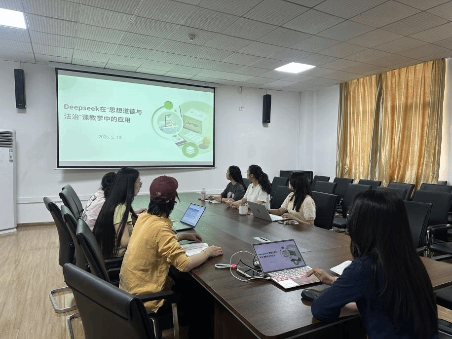 为推进人工智能和思政教育的深度融合,2025年5月13中午12点,思想道德与法治教研室全体教师以主题 “Deepseek在《思想道德与法治》课教学中的应用”进行讨论学习。主讲教师张祥贝就如何在教学内容优化、个性化学习支持、创新教学方法三个方面进行Deepseek应用心得的分享。