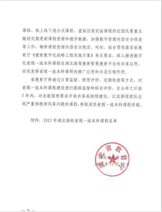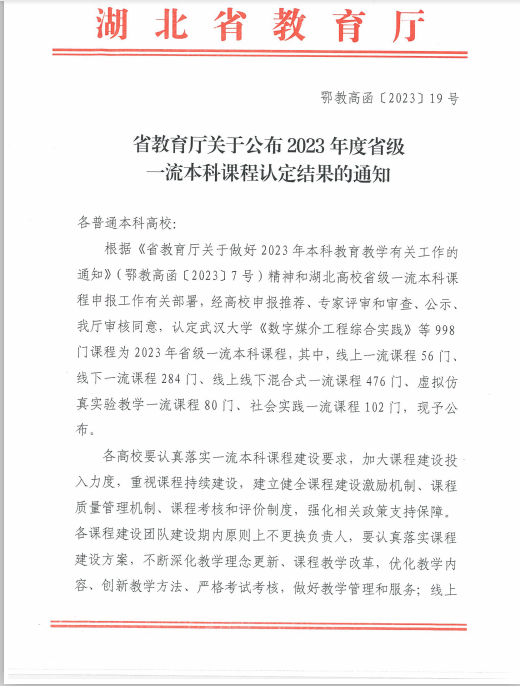 近日,湖北省教育厅公布了2023年度省级一流本科课程认定结果,公司《马克思主义基本原理》课程入选省级线上线下混合式一流课程,实现了公司省级一流课程建设零的突破。