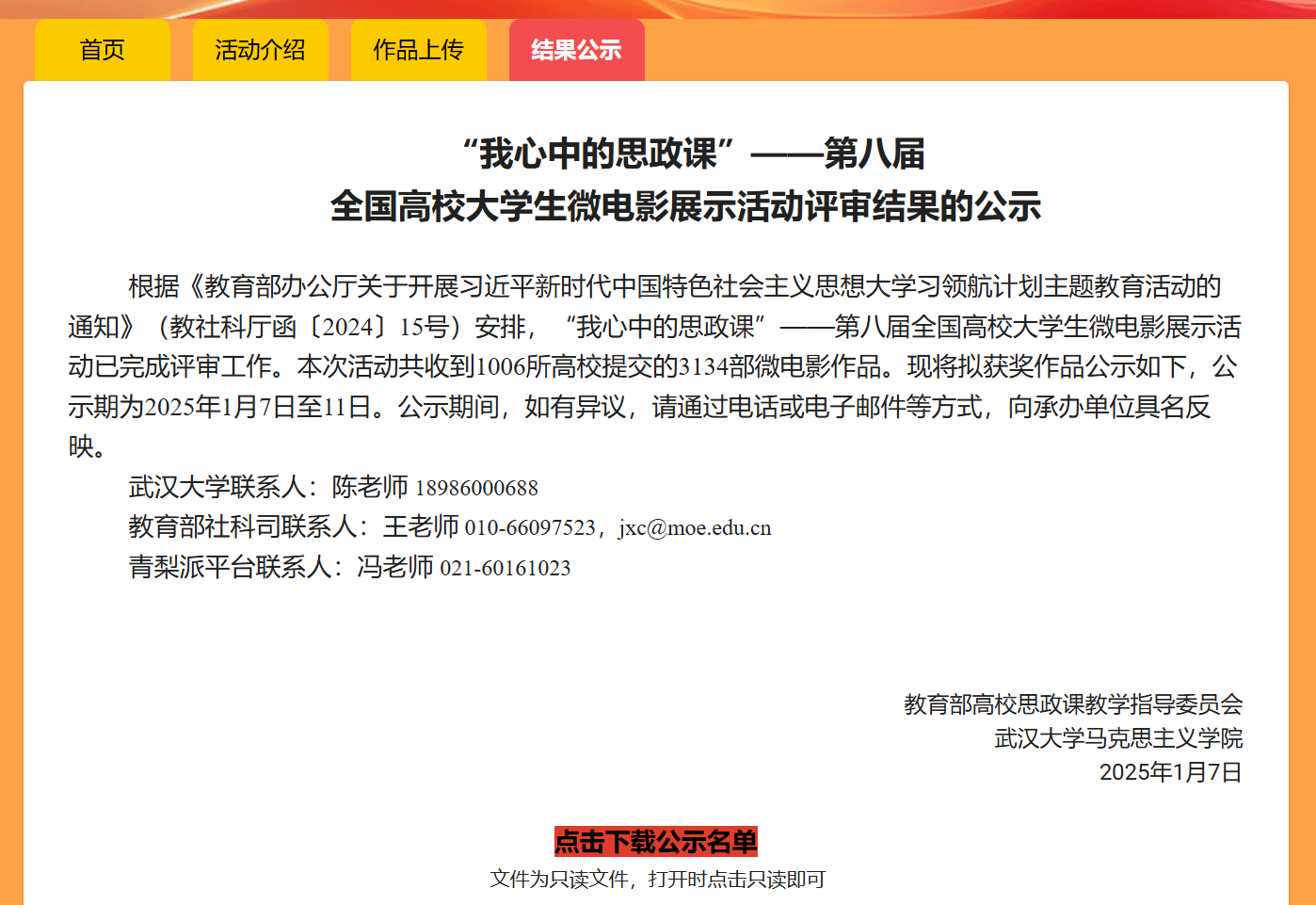 观看链接:【《朝霞》完整版丨“我心中的思政课”第八届全国高校老员工微电影展示活动-哔哩哔哩】 https://b23.tv/msgRnb8