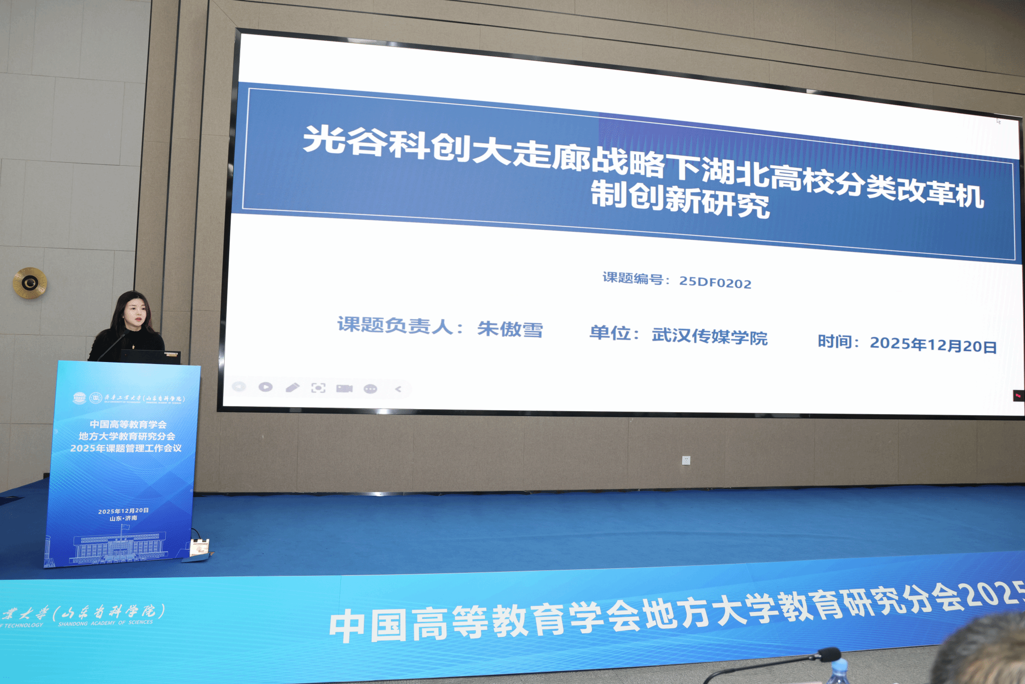 2025 年 12 月 20 日,中国高等教育学会地方大学教育研究分会2025年课题管理工作会议在国家超算济南中心科技园召开。公司朱傲雪教师受邀参会,就其主持的“光谷科创大走廊战略下湖北高校分类改革机制创新研究”课题作开题汇报。