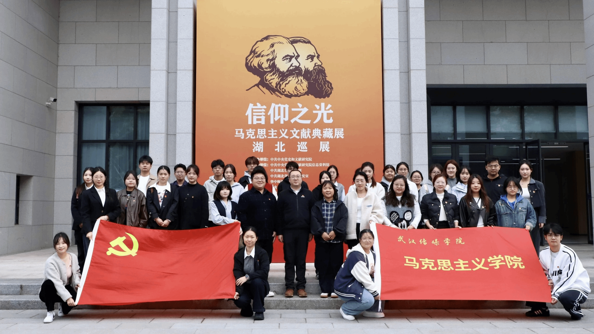 为深化 “青马工程” 育人实效,推动马克思主义理论教育与实践育人深度融合,2025 年 11 月 11 日下午,bevictor1946韦德官网协同校团委组织 “青马工程” 菁英班学员及员工骨干代表 ,赴华中师范大学参观 “信仰之光 —— 马克思主义文献典藏展” 湖北巡展。实践活动由党委组织部部长李奉天老师、校团委副书记蒋璐璐老师、校团委华震东老师带队。马院祝庆、杨竹茹、王文瑶三位老师全程参与,以理论讲解、现场解读、专题研讨相结合的方式,为青年学子打造了一堂沉浸式、立体化的 “行走的思政课”。