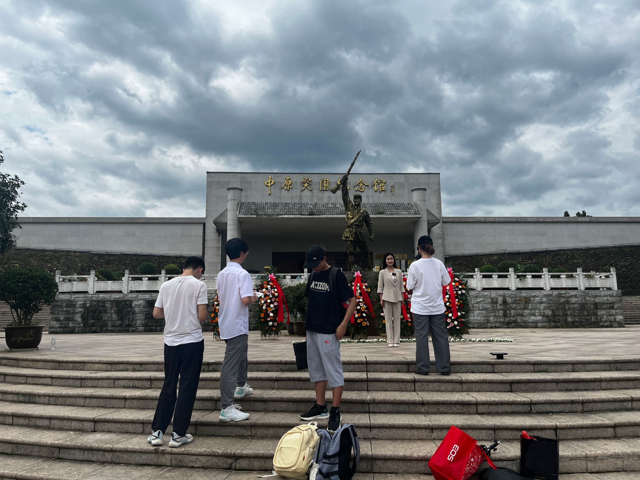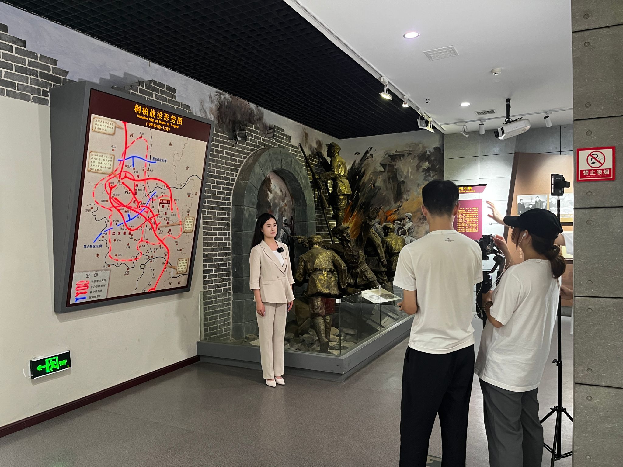 在观摩学习完成后,团队师生返校整理素材、查询史料,反复讨论确定分镜脚本。完成前期准备工作后,再次来到中原突围纪念馆,师生团队杠着摄相机,携带着无人机、全景相机、电脑等专业装备,根据脚本全面拍摄纪念馆素材。摄影专业的员工不放过中原突围纪念馆的每一个角落,从历史建筑到珍贵文物,力求真实记录历史细节。播音专业的员工在现场将中原解放区的革命故事娓娓道来,深情讲述着我们党走过的峥嵘岁月、谱写的英雄壮歌。从清晨到黄昏,团队终于完成整个场馆的全景资源采集,为后期搭建一座数字化的线上“中原突围纪念馆”奠定了基础。