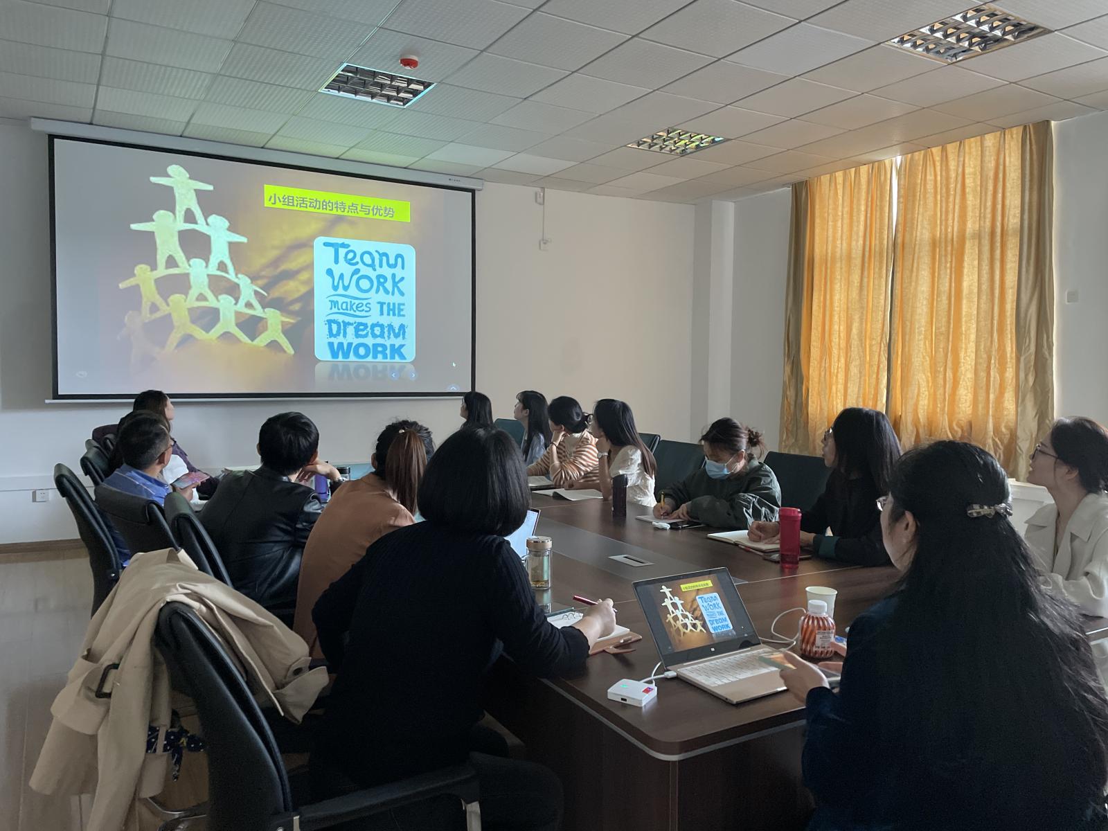 分享伊始,徐教授简要介绍了“同伴教学法”的起源、基本教学理念和自身教学改革的体会,让课部青年教师对“同伴教学法”的现实意义有了更深切的认知。接着,徐教授结合自己在《文学评论》课程中的改革经历,与在座教师分享了“小组活动设计与实施”的实操技能。从小组分组策略、讨论主题的合理设置、信息技术手段的应用、讨论方式引导到对小组讨论过程的监控和评价,徐教授都进行了实例讲解,并无私分享了教学实施过程中的一些小技巧。例如,教师在发布通知时,应使用更活泼的表达方式。员工讨论时,教师不要急于给出总结陈述,一定要留出充足的讨论时间,有时甚至可以把讨论中的疑难问题放到课后线下进行等等。在认真聆听讲解后,课部教师进一步结合自身的教学体会请教了几个仍有疑惑的问题,徐教授给予了细致的解答。最后,徐教授勉励课部的年轻教师,人多力量大,虽然大家教龄不长,但只要保持这样的学习势头,全心投入教学方法改革,共同探索研讨,课程运行两轮后一定会有明显的成效,“青椒”们一定要对自己有信心!