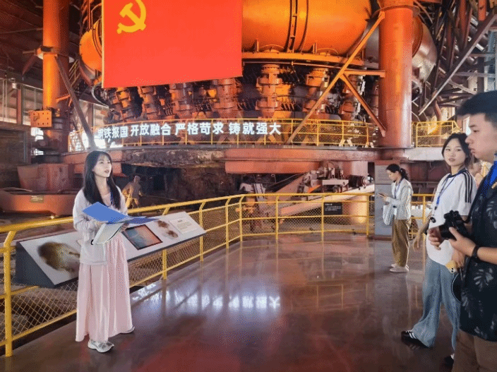 在一号高炉遗址出铁口工人身穿工作服迎接铁水出炉的雕像前,张晓晓老师讲述了全国劳模李凤恩“陪炉吃、伴炉睡”的动人故事。同学们由衷感叹:“这些故事不是书本上的铅字,而是刻在钢铁上的信仰。”